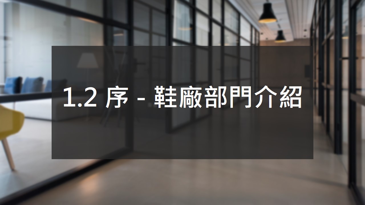 哈囉大家好~ 歡迎來到第二堂課的介紹序,鞋廠部門介紹 , 上一堂課上完不知道大家有沒有更了解鞋業概況以及各個集團呢?那我們接下來要讓你認識鞋廠的部門組織,在這個課程裡面我們會告訴你每個部門的工作項目, 並且在最後讓各位有比較清楚的概念,知道該如何選擇部門,在投履歷時就能清楚的確定你想去哪個部門,在鞋業比較特別的是即使你是社會新鮮人沒有什麼經驗,也能有機會挑選不是本科系的工作內容,只要你敢開口詢問,努力爭取.所以勇敢選擇自己喜歡的工作內容吧!